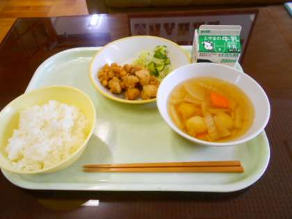 今日の給食は、ごはん、牛乳、鶏肉と大豆のあまからめ、きざみ和え、つみれ汁です。