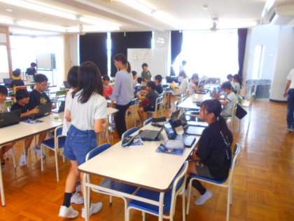 今日は、5年2組が国語科で問題解決型の学習に取り組んでいました。一人一人が課題を見付け、自分に合った調べ方、学び方で自分の課題の解決をめざしていきます。一人で調べ考える子、友達と話し合って考える子、図書を活用して調べる子、ネットで調べる子など、一人一人が選択し学んでいます。(写真中)