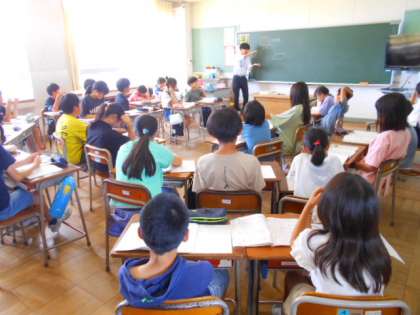 一方、5年1組の算数科は、全体で話し合う一斉授業で、図形の基本的な特徴を捉える学習でした。(写真下)