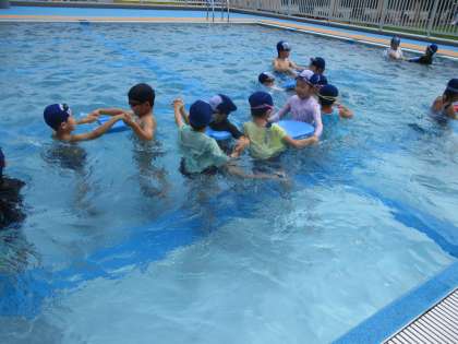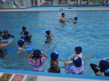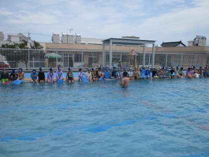 今日は、校長先生を特別コーチにお迎えして、水に親しみ、水に慣れる活動をたくさん教えてもらいました。ペアや4人グループで手をつないで浮かせたビート板を囲みながら歩いたり、リレーをしたり、、、 友達と一緒なら多少水がかかろうとも、怖くない、どの子供も笑顔いっぱい、プール学習を楽しみました。
