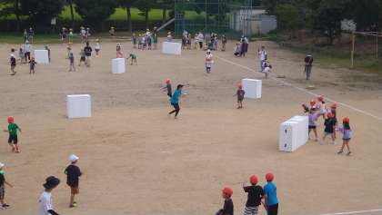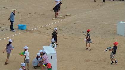 150周年記念特別かがやき教室が始まりました。水鉄砲バトルで、走ったり、隠れたりし、ポイを守りながら水鉄砲で攻撃することを楽しんでいます。