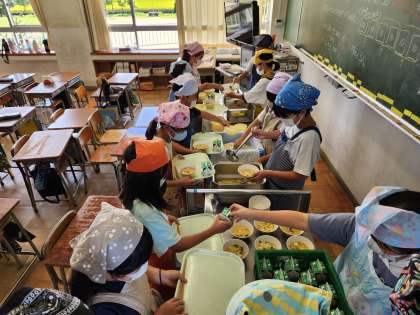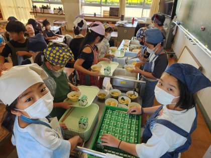 今までと違う食缶に驚きつつも、てきぱきと当番活動に取り組みました。