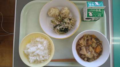 今日の給食は、ごはん、牛乳、小籠包、チンゲンサイひたし、回鍋肉です。今日の暑さを吹き飛ばしてくれそうなスタミナメニューです。宮野小学校からトラックが到着すると、一階の廊下では「あ、給食がきたよ!」「ありがとうございます!」と、明るい声が響きます。
