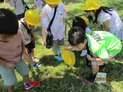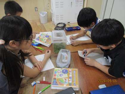 生活科で生き物を探し、育てています。草むらにぴょんぴょん跳ぶバッタに興味津々。育てるためにえさを準備したり、すみかを工夫したり、大切に育てようと一生懸命な子供たち。元気に過ごせるよう、小さな命を守ろうとはりきってお世話しています。