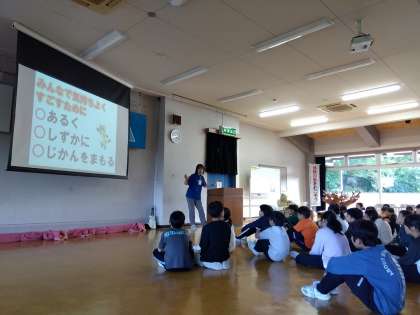 オリエンテーションで、所員の方から部屋の使い方やベッドメーキング、明日の片付けについて説明してもらいました。初めての宿泊学習は、ここからが肝心です。