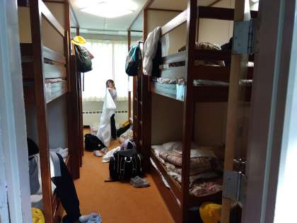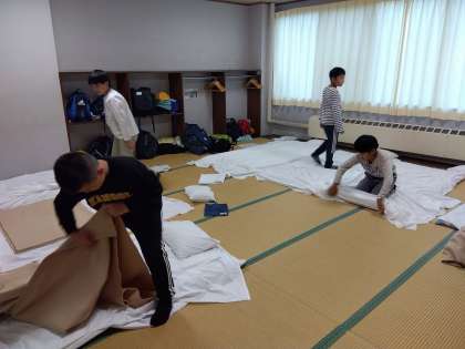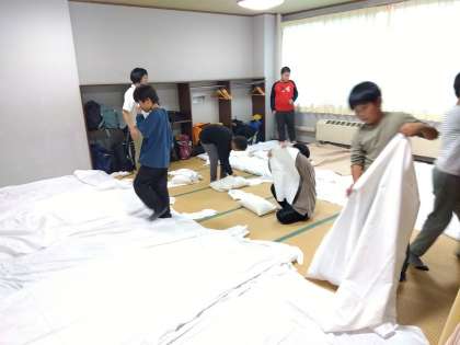 自分の寝床は、自分でつくります。友達と協力しながらがんばっています。男子は、和室です。どうやったら人数分の布団が敷けるか!まずは、そこからです。女子は洋室です。2段ベッドの狭い空間でベッドメーキングするには、少し工夫がいるそうです。試行錯誤しながらやってみること、これも大切な学びです。
