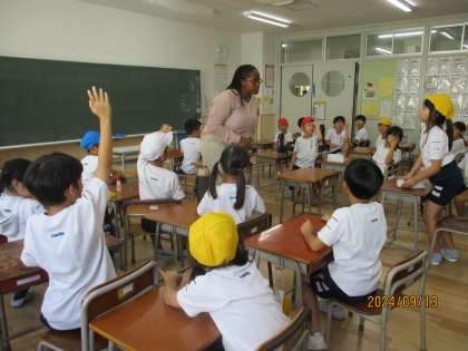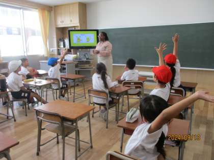 ALTの先生と2年生初めての外国語学習を行いました。先生の自己紹介を聞き、まだ見ぬ国の食べ物や国の花や鳥、魚等を知って、興味深々。好きなものを進んで先生に質問したり。答えたり、楽しく学ぶ時間になりました。