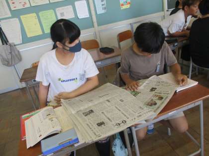 国語の授業で、新聞の読み方を学びました。実際に北日本新聞や読売新聞、富山新聞を読み見比べることで各新聞の見出しや取り上げ方の違いなども見つけました。