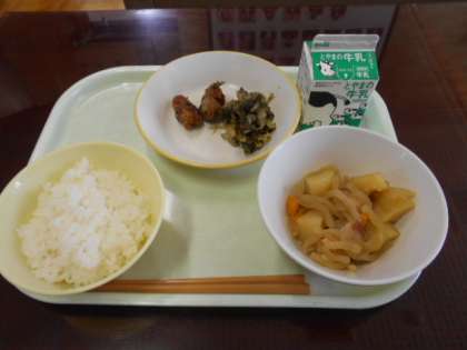 今日の給食は、ごはん、牛乳、ちくわの南部揚げ、磯和え、ベーコンとじゃがいもの煮物です。