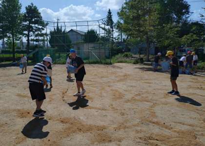 今日は新保っ子タイムに、グラウンドの凹んでいるところに土を撒いたり、草むしりをしたりしました。