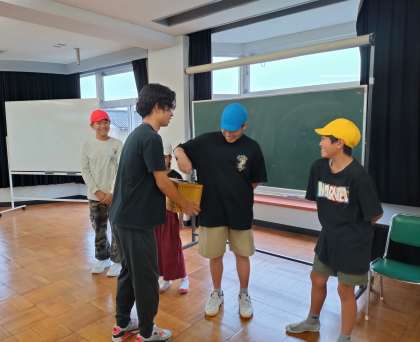 給食の時間にMeet放送を行い、応援団長のくじ引きで応援パフォーマンスの順番を決めました。