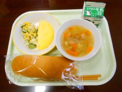 今日の給食は、コッペパン、牛乳、チーズオムレツ、カラフルサラダ、マカロニスープです。