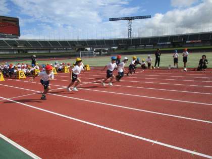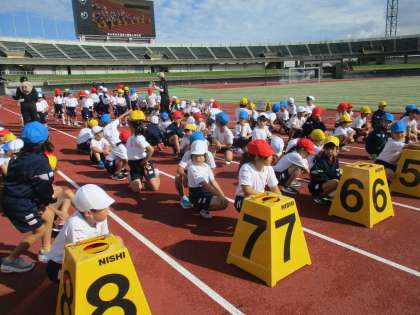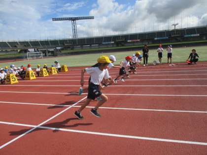 今日は、運動会予行でした。2年生はトップバッター、張り切って並びました。50メートル走の様子です。