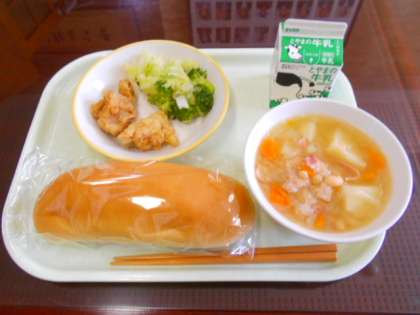 今日の給食は、コッペパン、牛乳、フライドチキン、そえ野菜、豆とベーコンのスープ煮です。