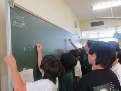 日曜日にひかえた運動会に向けて一人一人意気込みを黒板いっぱいに書きました。運動会では、これまでの練習の成果を発揮し全力を尽くしてほしいです。