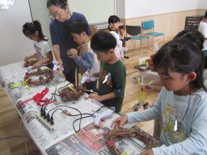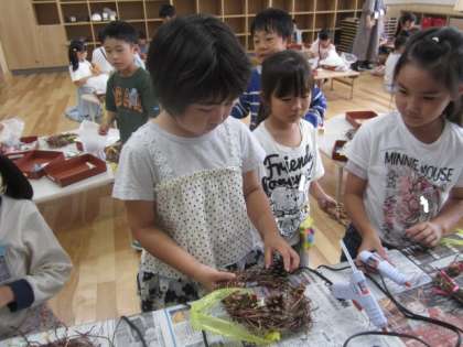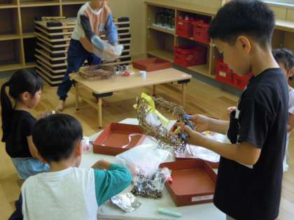 5月からお世話していたあさがおの蔓を使って、リース飾りを作りました。ドングリや木の実を付けたり、ハロウィーンやクリスマス仕様に飾り付けたりと、子供たちはそれざれ思い思いのリースに仕上げていました。「秋のハロウィーンバージョンにしてみたよ」「上手にできたから、早く家で飾りたい!」と、家に持ち帰って飾るのが楽しみなようです。