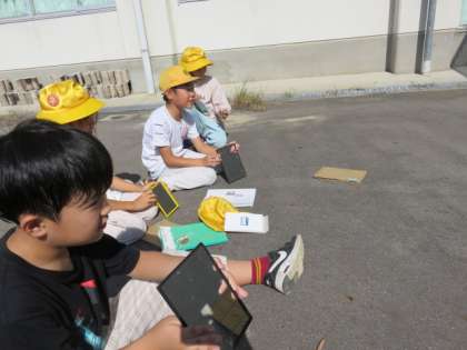 鏡を使って日光を跳ね返し、日陰にある的に当ててみました。気付いたことや疑問の思ったことから、はね返した日光について課題をを見いだしていきました。