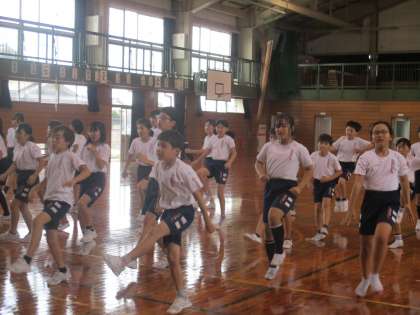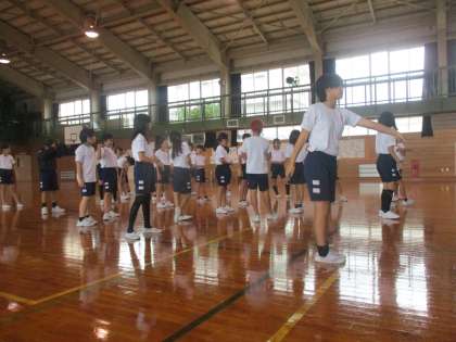 体育の授業では、ダンス練習に取り組んでいます。音楽をよく聴いてタイミングをそろえて踊ることを意識して練習しています。