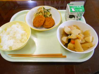 今日の給食は、ごはん、牛乳、メンチカツ、ごまびたし、おでんです。