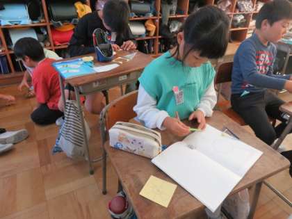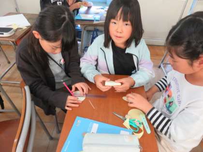 3年生:まるい形を調べよう:10月29日(火) 公開日 2024/10/30 更新日 2024/10/30 3年生の部屋 手作りのこまを回して遊びました。よく回るこまは、軸が真ん中にあって安定していることが分かりました。折り曲げたり、定規でうまく回らないこまとうまく回らないこまと比べたり・・・よく回るこまの形について調べました。