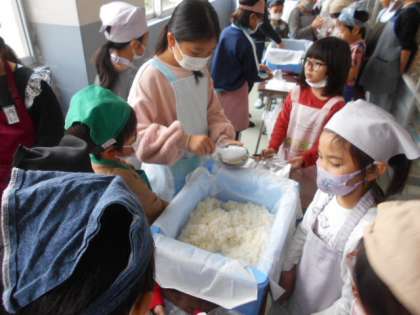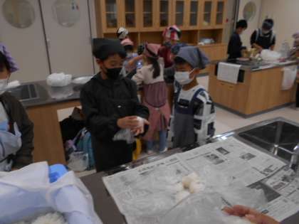 今年は、新館が出来たので、新館家庭科室、多目的室、本館2F3Fランチルーム、理科室、音楽室に分かれ調理しています。以前より、広いスペースで調理できるのでスムーズに進んでいます。