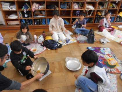 グラウンドの状態が悪かったので校舎内で食べることになりました。各縦割り班で自分たちで作ったさつま汁を楽しく味わいました。今年は、すごいはやさで完食する班が多く見られました。初めての「さつま汁会」だった1年生からは「ぼくがちぎったこんにゃくだよ」や「おにぎりをつくるのがたのしかった」、「とてもおいしくかったよ」等の声が聴かれました。自分たちでつくったことが、おいしさの秘密だったようです。