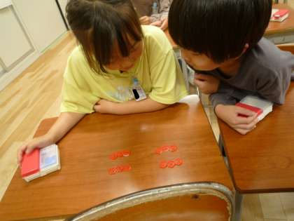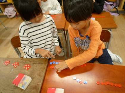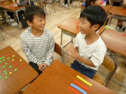 算数の時間には、かけ算の学習をしています。今日は、かけ算の式をおはじきで表しました。決められた式をおはじきで表したり、自分で考えた式をおはじきで表したりしました。今日の学習の終わりには、友達が並べたおはじきを見てどんな式になるのかを考え、互いに伝えていました。