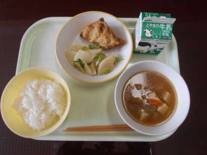 今日の給食は、ごはん、牛乳、魚のえごま揚げ、かぶの彩り、根菜汁です。
