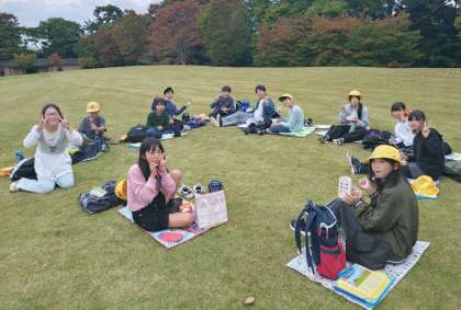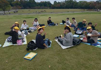 金沢城公園でお昼ご飯です。トンビに気を付けて、美味しくお弁当をいただいています。