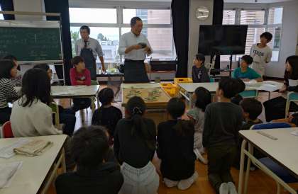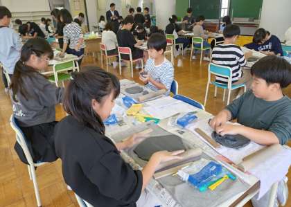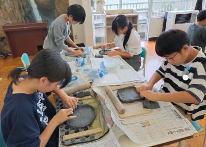 講師の方に来ていただき、粘土とガラスを使って作品づくりをしています。完成した作品は、乾かした後、1200度で焼きしめます。