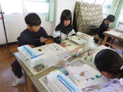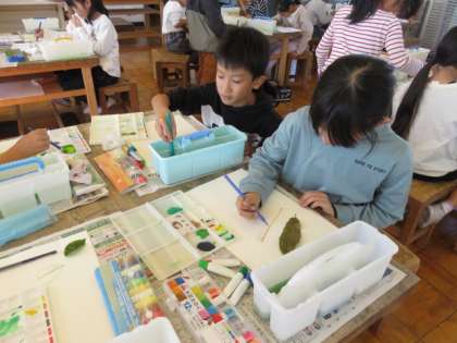3年生:お気に入りの葉っぱ:11月8日(金) 公開日 2024/11/11 更新日 2024/11/11 3年生の部屋 グラウンドでお気に入りの葉っぱを見付け、図工の時間に葉っぱの絵を描きます。穴が開いている葉っぱや先がとがっている葉っぱ、黄色や赤が混じり合って色付き始めている葉っぱ・・・お気に入りの一枚を、よく見ながら描きました。