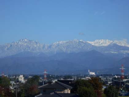 今日も天気がよく、さわやかな秋晴れです。先日、やっと立山に雪が降りました。ところで、どの山が立山か知っていますか。画像は、雪が降った次の日に撮ったものです。