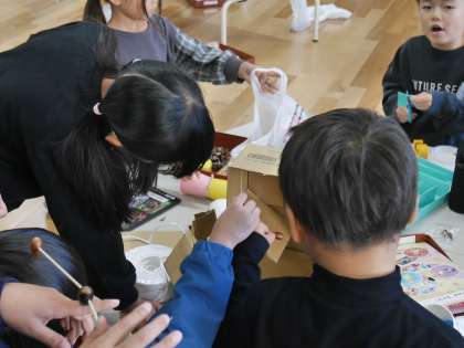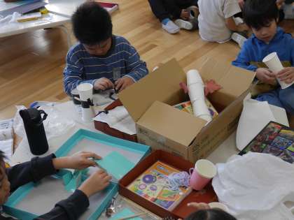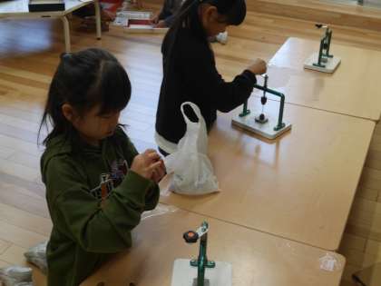 生活科で見つけた秋で遊ぶ活動をしています。どんぐりのこま、まつぼっくりのけんだま、めいろ等、自分でどのようにして遊びたいか決めて作りました。遊びができあがると、お互いに「やらせて!」「ここ面白い!」と、言いながら楽しみました。