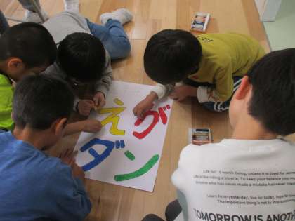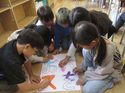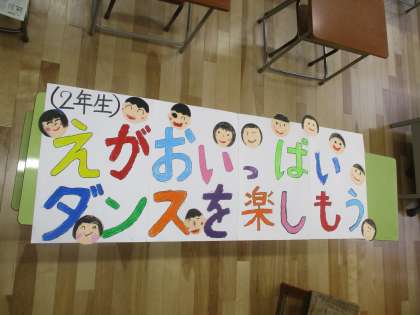 学習発表会に向けて、2年生の目当てを決めて取り組んでいます。今日は、体育館に掲示する紙をみんなで協力して仕上げました。「笑顔いっぱい、ダンスを楽しもう」の目当てが達成できるよう、2年生の心を一つに本番もがんばります。
