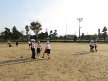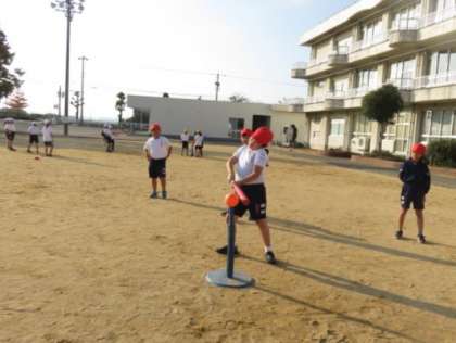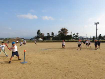 ティーボールは、静止したボールを打つ易しいベースボール型ゲームです。バットを思い切り振る感覚が新鮮なこともあり、野球が未経験の子供もバッティングが楽しいようです。守備は、ボールを受けたら近くのフープの中に入り、全員が入るのが早ければアウトにできます。勝ち負けに関係なく、ゲームを楽しんでいました。