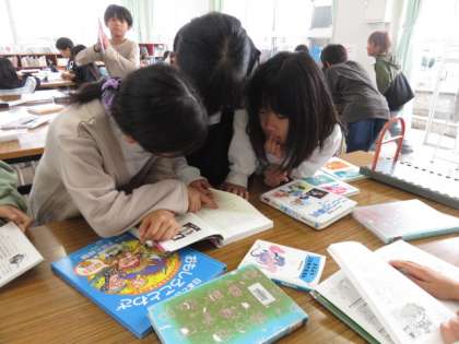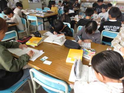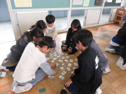 ことわざや故事成語の意味を知り使う学習です。ことわざを集めた「いろはかるた」で取った札の中から、お気に入りのことわざを選び、意味を調べました。カードにことわざとその意味を記入し、絵も描きました。友達と見合いながら、楽しく取り組んでいました。