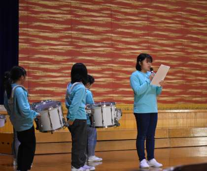 鼓隊クラブは、運動会に続いて練習の成果をお客さんの前で披露しました。運動会から1曲増やし、動きも入れてさらに磨きをかけた演奏を聴いていただくことができました。