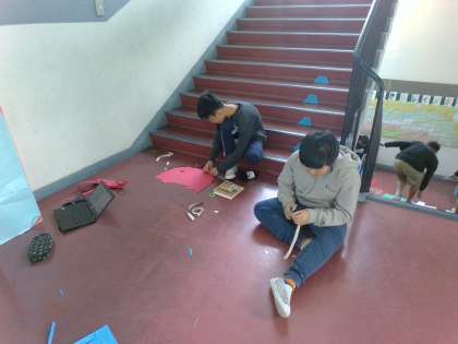 遠近法を使って見る人が楽しくなるものを作りました。木やロケット、記号等、画用紙や紐を使って作り、最後はクロームブックで撮影しました。