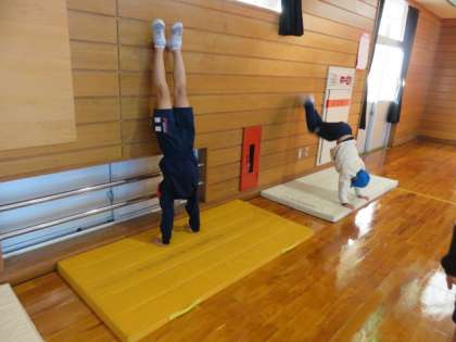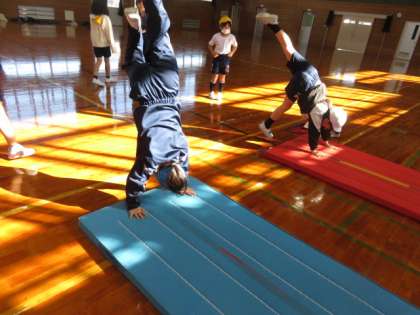 「わざセブン」のマットと鉄棒の技に挑戦しました。壁上り→壁倒立→倒立前転と、レベルアップしていきます。鉄棒は、補助つきで逆上がりができることが銅賞です。毎週火曜日の「すこやかタイム」に練習してきた成果も見られ、できる技がふえてきました。