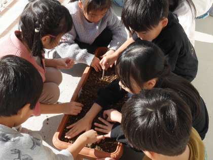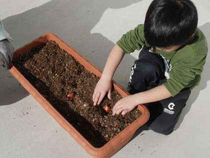 1年生でチューリップの球根を植えました。入学式の頃咲くのが楽しみです。