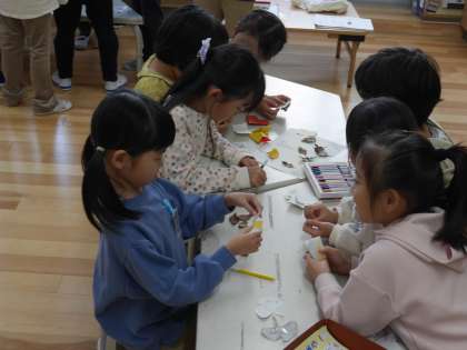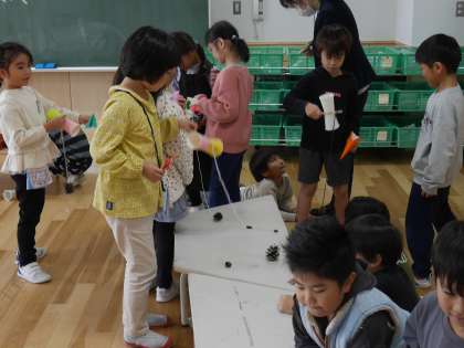 1年生:秋のおもちゃランド1組:11月27日(水) 公開日 2024/11/28 更新日 2024/11/28 1年生の部屋 2組を招待して「秋のおもちゃランド」を開きました。遊びコーナー、体験コーナー、勝負コーナー等、いろいろな遊び方があって、2組の友達も次はどこへ行こうかとわくわくしながら回っていました。自分がつくったおもちゃで遊んでもらったり、考えたルールを説明して勝負したりして楽しむことができました。