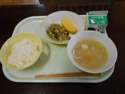 今日の給食は、ごはん、牛乳、厚焼き卵、野菜のオイスターソース炒め、豚汁です。