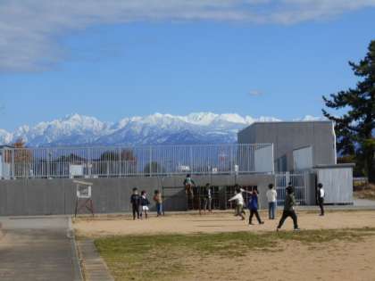今日は、午前中はよく晴れていましたが、午後から少しずつ雲が広がってきました。天気予報では、今週末に雪マークが出ています。なかなか外で遊ぶことができなくなりそうです。画像は、晴天だった昨日のものですが、すっかり雪化粧をした立山連峰をバックに子供たちが遊んでいる様子です。冬を迎えますが、寒さに負けず、晴れ間を見付けて、元気に外で活動して欲しいと思います。