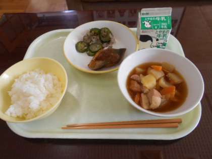 今日の給食は、ごはん、牛乳、揚げ魚のみぞれだれ、ゆかり和え、豚肉とじゃがいもの南蛮煮です。