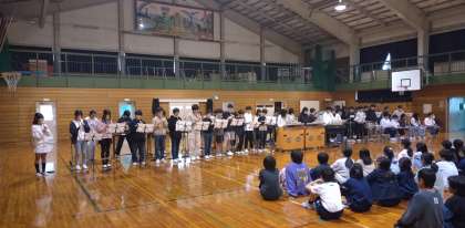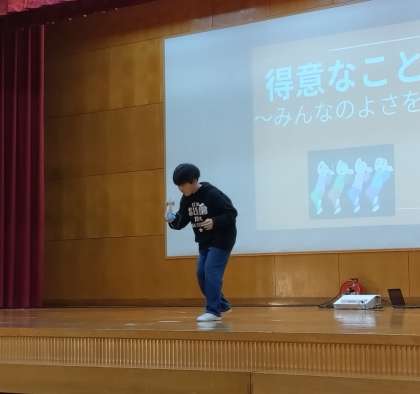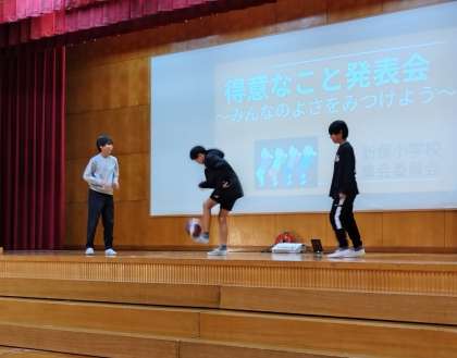 集会委員会の企画「得意なこと発表会」がありました。6年生からは音楽科の時間に練習してきた合奏「Bling-Bang-Bang-Born」やダンス、リフティング、けん玉を披露しました。