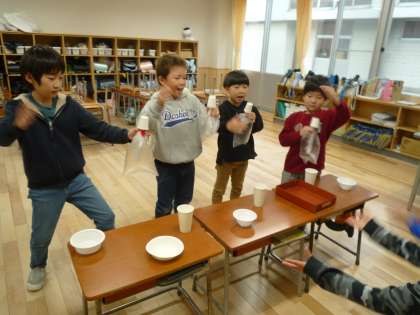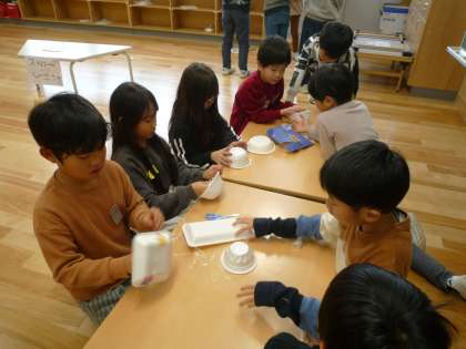 今日は、2組が動くおもちゃを使った遊びを学級内で体験しあいました。「もっと遊びたかった!」「壊れやすいから、直さないといけないな」等、良いところやもっとパワーアップできそうなことが見つかりましたね。もっとわくわくしたお店になるようにもう一踏ん張り!頑張りましょう!