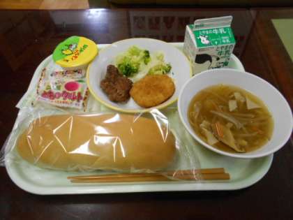 今日の給食は選択献立です。コッペパン、牛乳、豚肉の米粉揚げorえびカツ、そえ野菜、ワンタンスープ、はちみつレモンゼリーor桃タルトです。