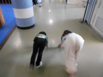 新保小学校では、縦割り班で掃除をしています。上級生が下級生にやり方を教えたり一緒に掃除したりしています。金曜日は、床の水拭きDayです。1年生でも、ぞうきんを絞り一生懸命ぞうきんがけをしています。