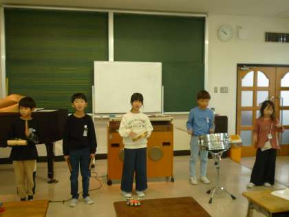 「かぼちゃ」の曲に合わせて、色々な楽器の音を順番に重ねました。グループで重ねる順番を決め、練習した後発表会を行いました。グループによって、音を重ねる順番が異なっていることで強弱や雰囲気が変わる面白さを感じる時間になりました。