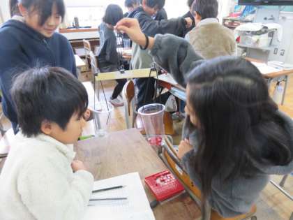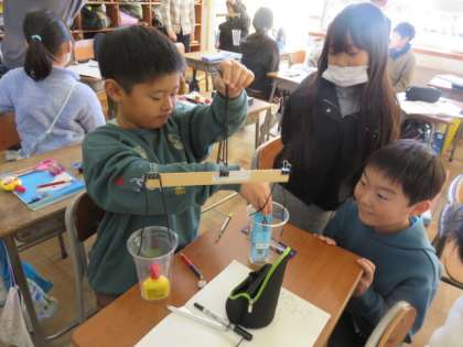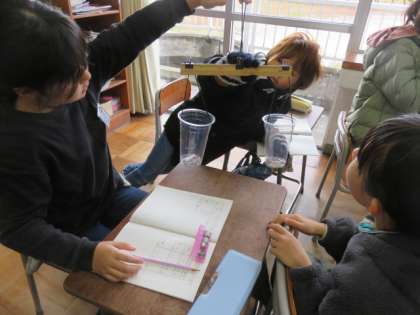 3年生:重さをはかって表そう:12月13日(金) 公開日 2024/12/13 更新日 2024/12/13 3年生の部屋 自作てんびんを使って、身の回りにある文房具の重さを比べました。傾き方に注目すると、下がっている方が重いことが分かります。長さやかさと同じように、重さも数で表せないかを考え、ブロックや1円玉が何個分かで表しました。それぞれが持っている消しゴムの重さを数で表し、消しゴムの重さランキングを調べました。